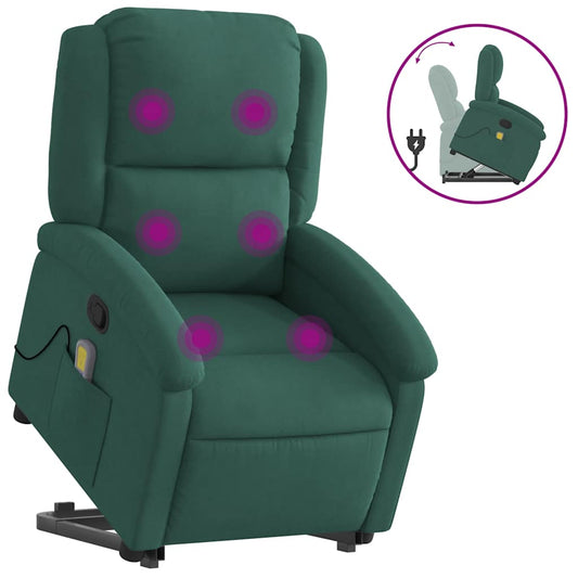 sötétzöld bársony felállást segítő dönthető masszázsfotel