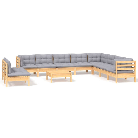 11 részes tömör fenyőfa kerti ülőgarnitúra szürke párnákkal