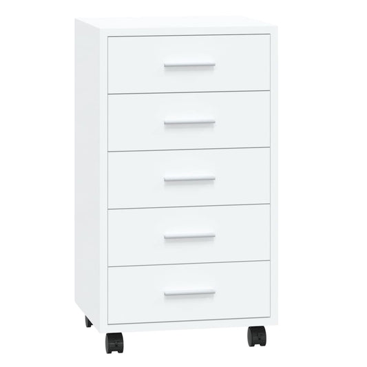 magasfényű fehér szerelt fa fiókos szekrény görgőkkel