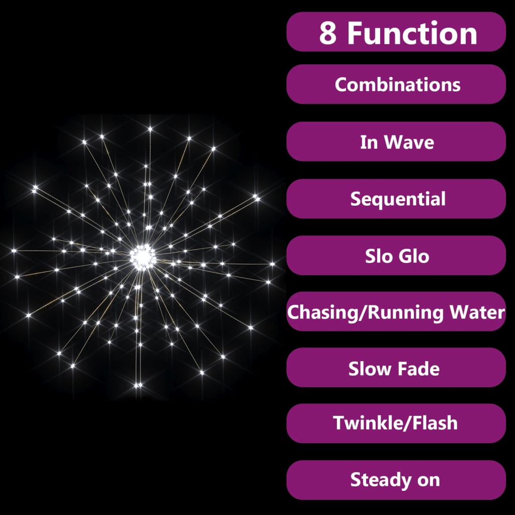 Az energiatakarékos LED-ekkel ellátott meteorlámpa fényes és erőteljes megvilágítást biztosít bel- és kültéren is. A lámpa 8 különböző fényeffekttel rendelkezik: az összes effekt kombinációja, hullámok, szekvenciális, lassan izzó, villanó, lassan halványuló, villódzó és folyamatosan világító. A csillagszórólámpa a mellékelt távirányítóval könnyen kezelhető. A rugalmas rézhuzaloknak köszönhetően könnyen hajlíthatja őket bármilyen formájúra.
