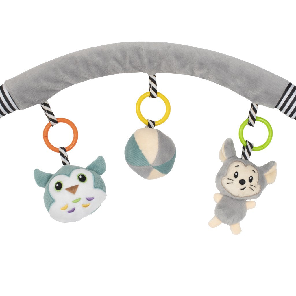 Színes játék Baby Mix babakocsira szerelhetõ. Plüss játékokkal rendelekezik, egérkét és baglyócskát tartalmaz. Két akasztóval felszerelt, amelyek segítségével rögzíthetõ babakocsira, pihenõszékre, autósülésre. A játék formái és színei vonzzák a gyermek figyelmét, tanítják, szórakoztatják és fejlesztik a gyermek fantáziáját. A játék minõségi és kényelmes anyagból készül. A játékok magassága cca 12 cm. A rögzítõkar hossza cca 80 cm. 3 hónapos kortól ajánlott.
