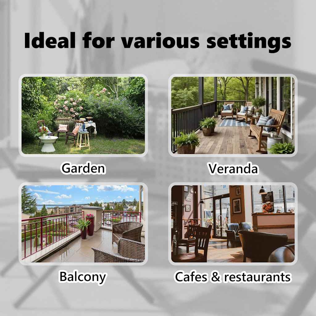 A poliamid bevonattal ellátott kiváló minőségű anyag fakulásálló és védelmet nyújt a nap káros sugaraival szemben, miközben légáteresztő-képességét is megtartja. Könnyen fel- és letekerhető a kézi karral. Ez a függőleges redőny két álló állvánnyal rendelkezik, melyek magassága 2 és 3 m között állítható. A legtöbb mennyezetmagasság esetében használható, és könnyen felszerelhető.