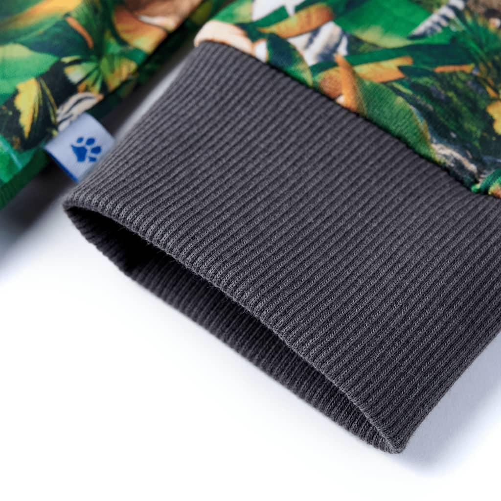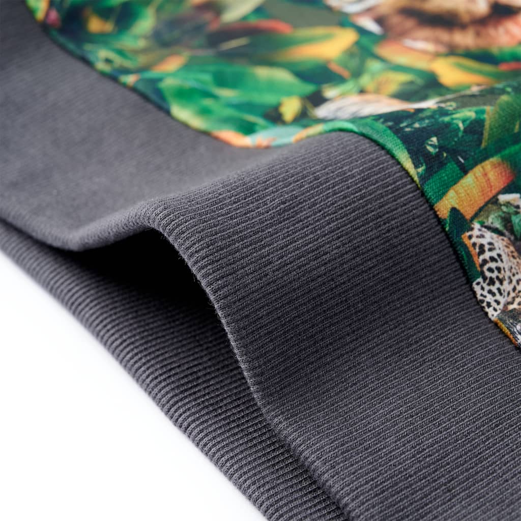 Ez a gyermek pulóver hosszú ujjú, kerek nyakú, bordás kötésű szegélyekkel rendelkezik a mandzsettáknál, a nyakkivágásnál és az alján. A gyermek pulóver állatokat és növényeket ábrázoló nyomtatással van ellátva. A gyerekeknek készült pulóver puha anyagból készült, amely 95% pamutot és 5% elasztánt tartalmaz a kényelem és a légáteresztő képesség érdekében.