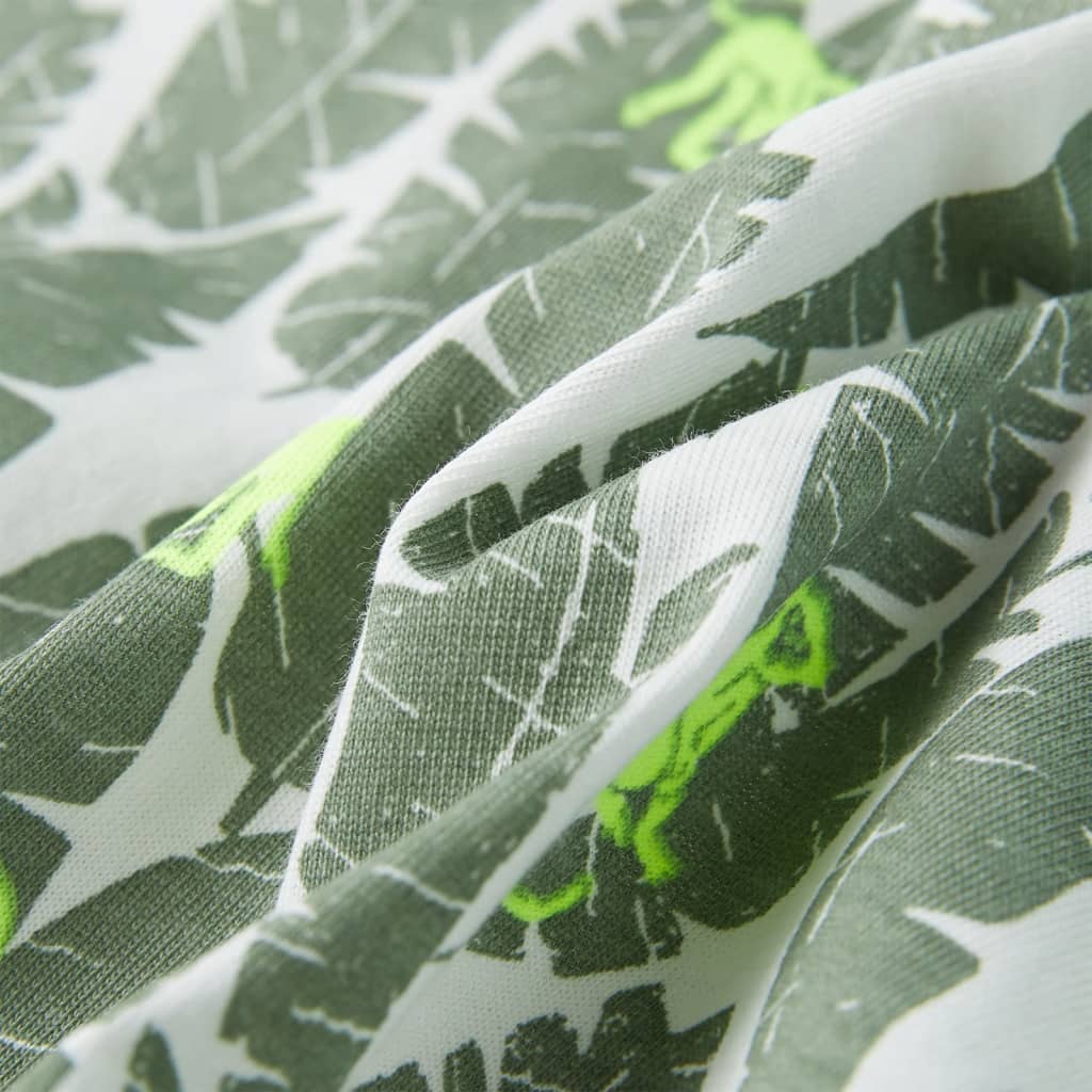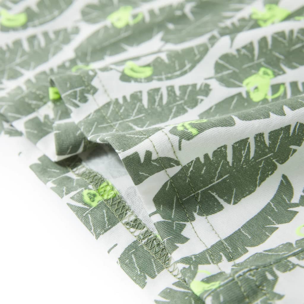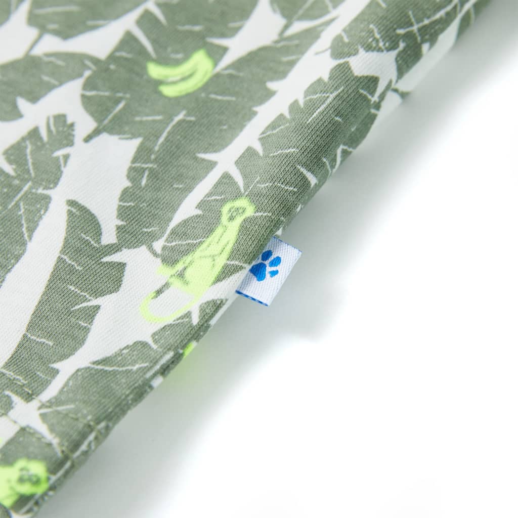 Ez a rövid ujjú gyerekpóló kerek nyakkivágású és egyenes szabású. A gyerekpólót levelek és kis majmok díszítik. A rövid ujjú gyerekpóló 100% pamutból készült a puha és kényelmes tapintás érdekében.