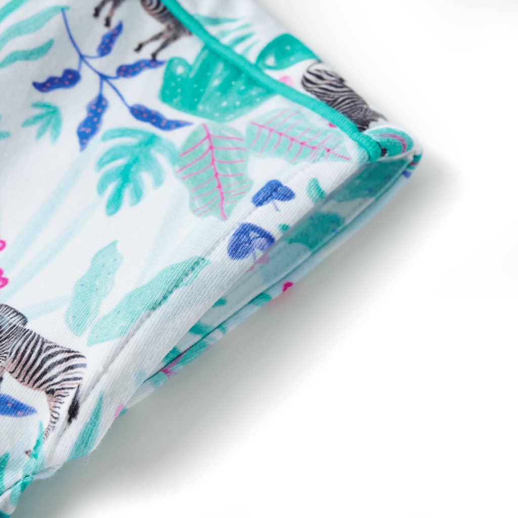 Ez a gyerekruha kerek nyakkivágással, buggyos ujjakkal, húzózsinórral ellátott elasztikus derékpánttal rendelkezik, a nyakánál pedig gombbal záródik. Ez a gyerekruha zebra-, virág- és levélnyomatos. A rövid gyerekruha puha anyagból készült, amely 94% pamutot és 6% elasztánt tartalmaz a kényelem és a légáteresztés érdekében.