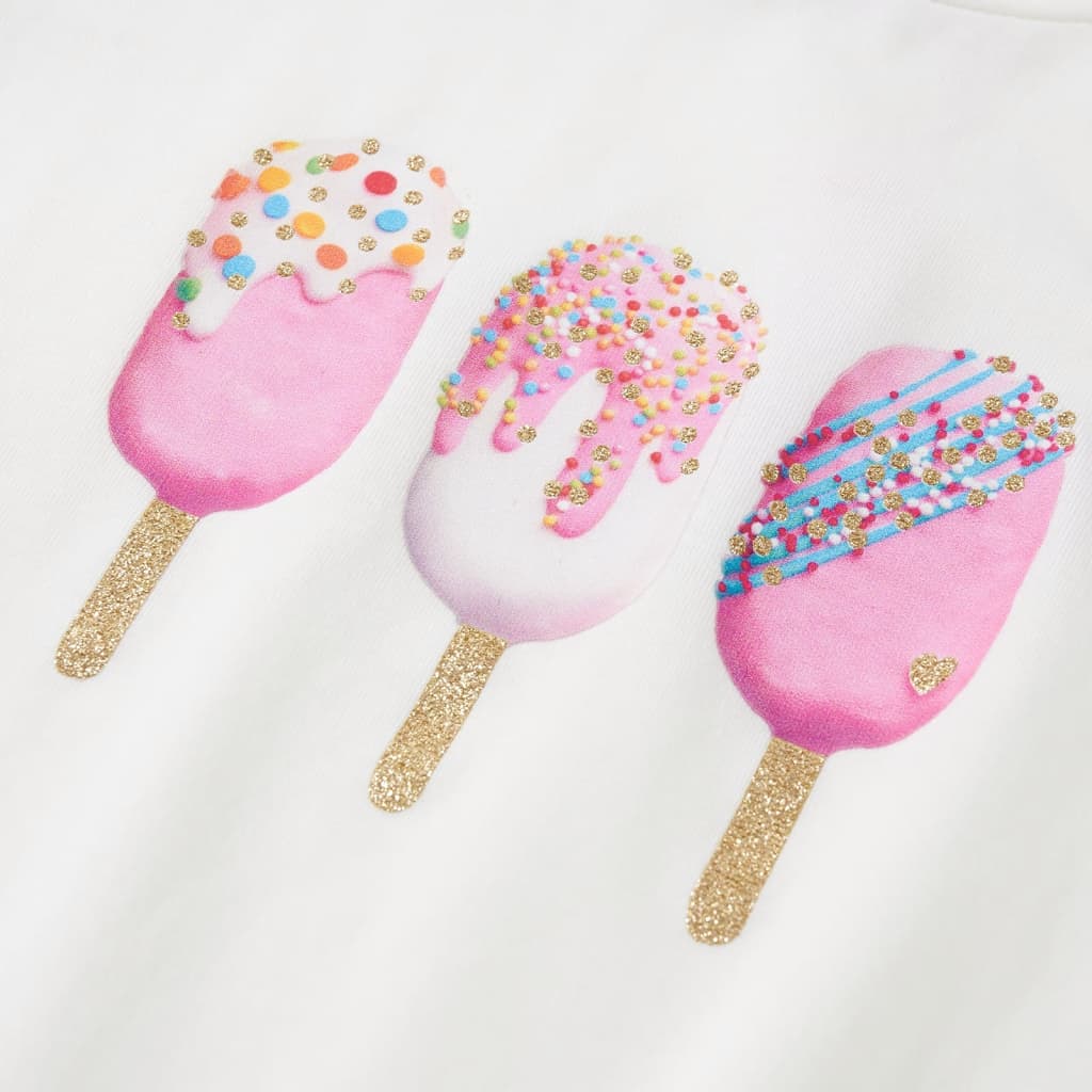 Ez a rövid ujjú gyerekpóló kerek nyakkivágású és egyenes szabású. Ezt a gyerekpólót fagylaltok díszítik. A rövid ujjú gyerekpóló 95% pamutból készült a puha és kényelmes tapintás érdekében.