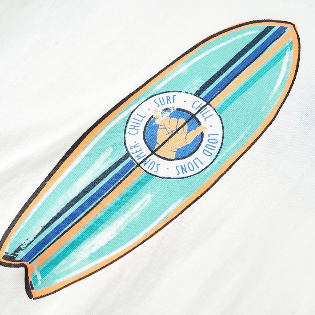 Ez a rövid ujjú gyerekpóló kerek nyakkivágású és egyenes szabású. A gyerekpóló elején színes szörfdeszka található. A gyerekpóló 100% pamutból készült a puha és kényelmes tapintás érdekében.