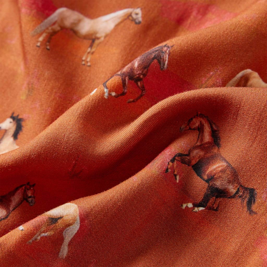 Ez a gyerekruha hosszú ujjú, szalaggallérral rendelkezik, és elöl gombokkal záródik. A lányruhát kedves lovakkal nyomtatták, a mandzsettáknál elasztikus, a deréknál és a térdnél pedig összegyűrt varrással rendelkezik.