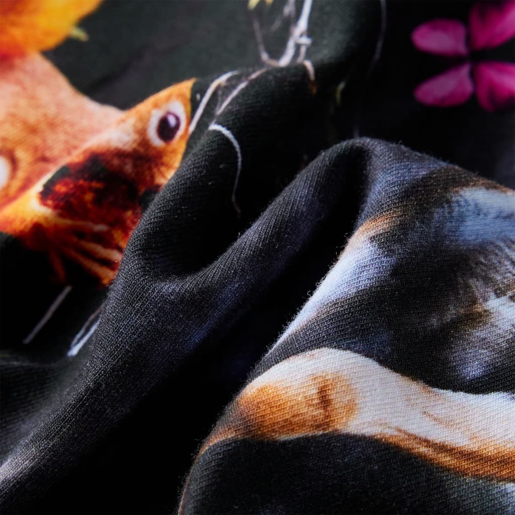 Ez a gyerekruha hosszú ujjú, kerek nyakkivágással rendelkezik, és hátul cipzárral záródik. Ez a tengerészkék színű gyermekruha szép szarvasos mintával díszített. A gyerek rövid ruha puha anyagból készült, amely pamutot, és elasztánt tartalmaz a kényelem és a légáteresztő képesség érdekében.