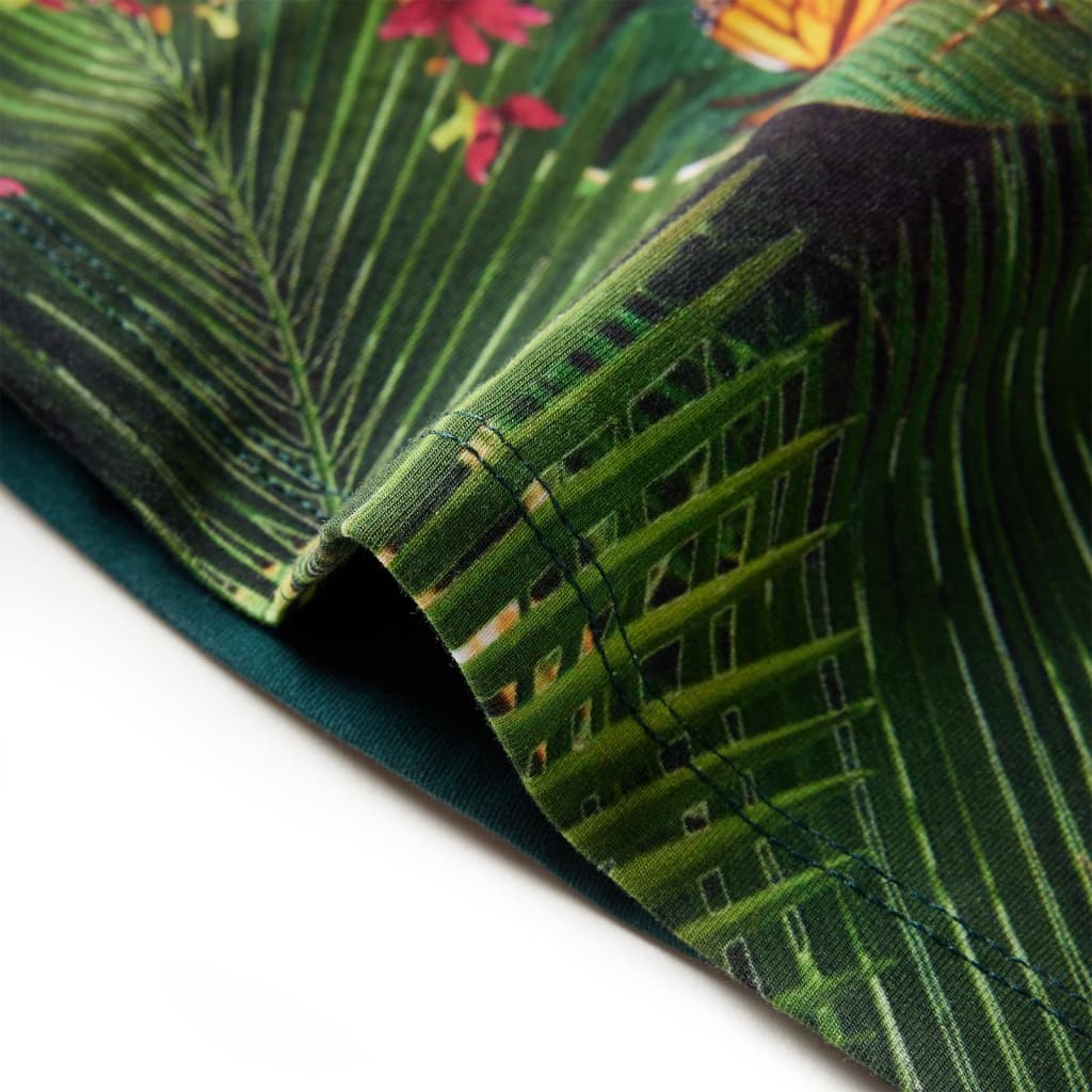 Ez a gyerekruha hosszú ujjú, kerek nyakkivágással rendelkezik, és hátul cipzárral záródik. Ez a sötétzöld gyerekruha gyönyörű macskamintával rendelkezik. A rövid gyerekruha puha anyagból készült, amely pamutot és elasztánt tartalmaz a kényelem és a légáteresztés érdekében.