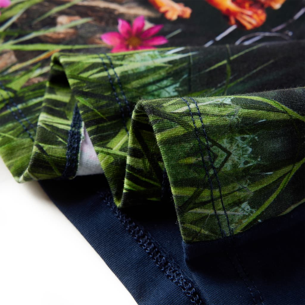 Ez a gyerekruha hosszú ujjú, kerek nyakkivágással rendelkezik, és hátul cipzárral záródik. Ez a tengerészkék színű gyermekruha szép szarvasos mintával díszített. A gyerek rövid ruha puha anyagból készült, amely pamutot, és elasztánt tartalmaz a kényelem és a légáteresztő képesség érdekében.