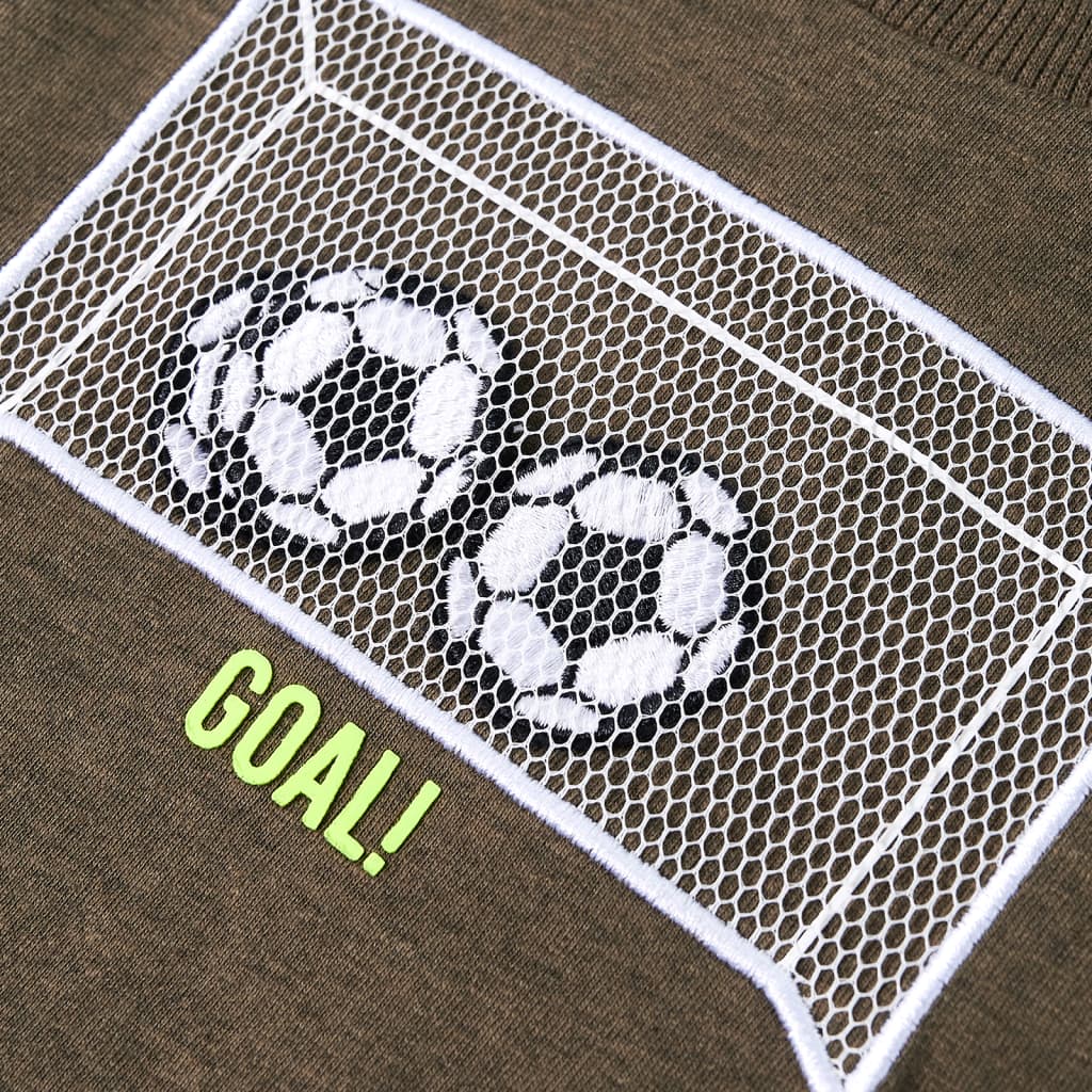 Ez a gyerek póló hosszú ujjú, kerek nyakkivágással és egyenes modellel rendelkezik. Ezen a khaki színű melange pólón egy focikapu látható. A hosszú ujjú gyermekpóló 80% pamutból és 20% viszkózból készült, amelyet szilikonos és enzimes mosással kezeltek a puha és kényelmes tapintás érdekében.