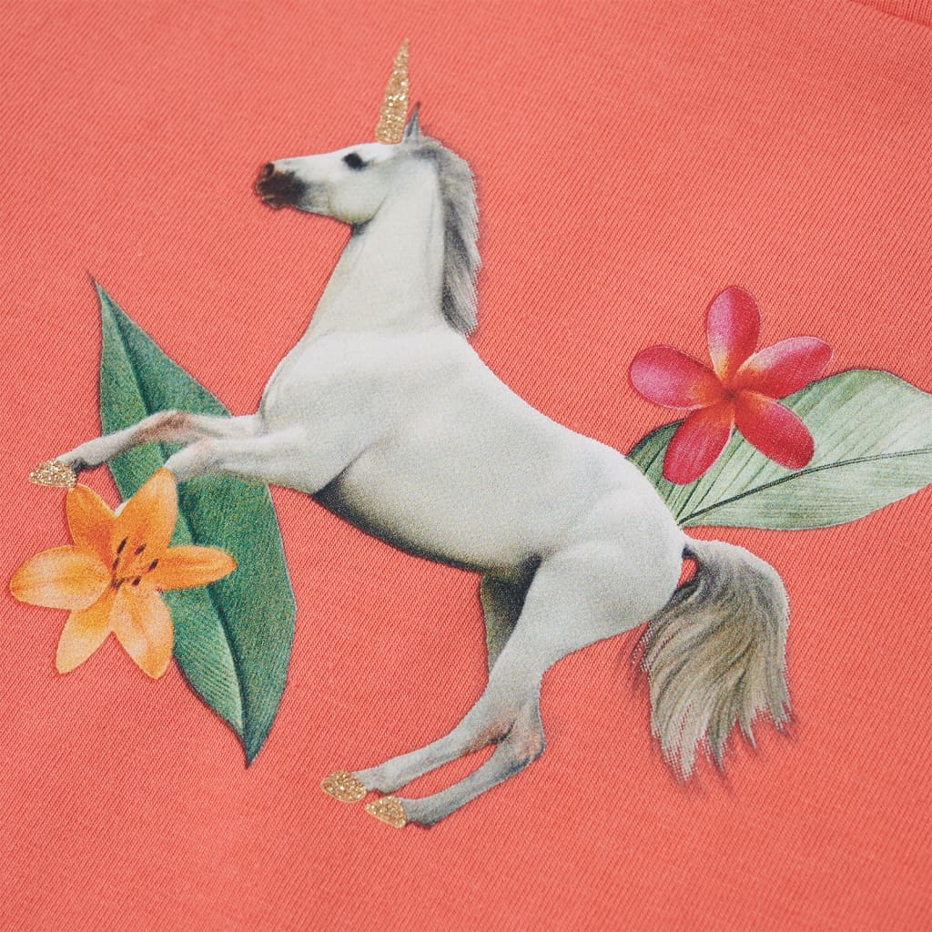 Ez a gyerekpóló rövid, fodros ujjal és kerek nyakkivágással rendelkezik, illetve egyenes szabású. Ezt a gyerekpólót egy gyönyörű egyszarvú díszíti levelek és virágok mellett. A rövid ujjú gyerekpóló puha anyagból készült, amely 95% pamutot és 5% elasztánt tartalmaz a kényelem és a légáteresztés érdekében.