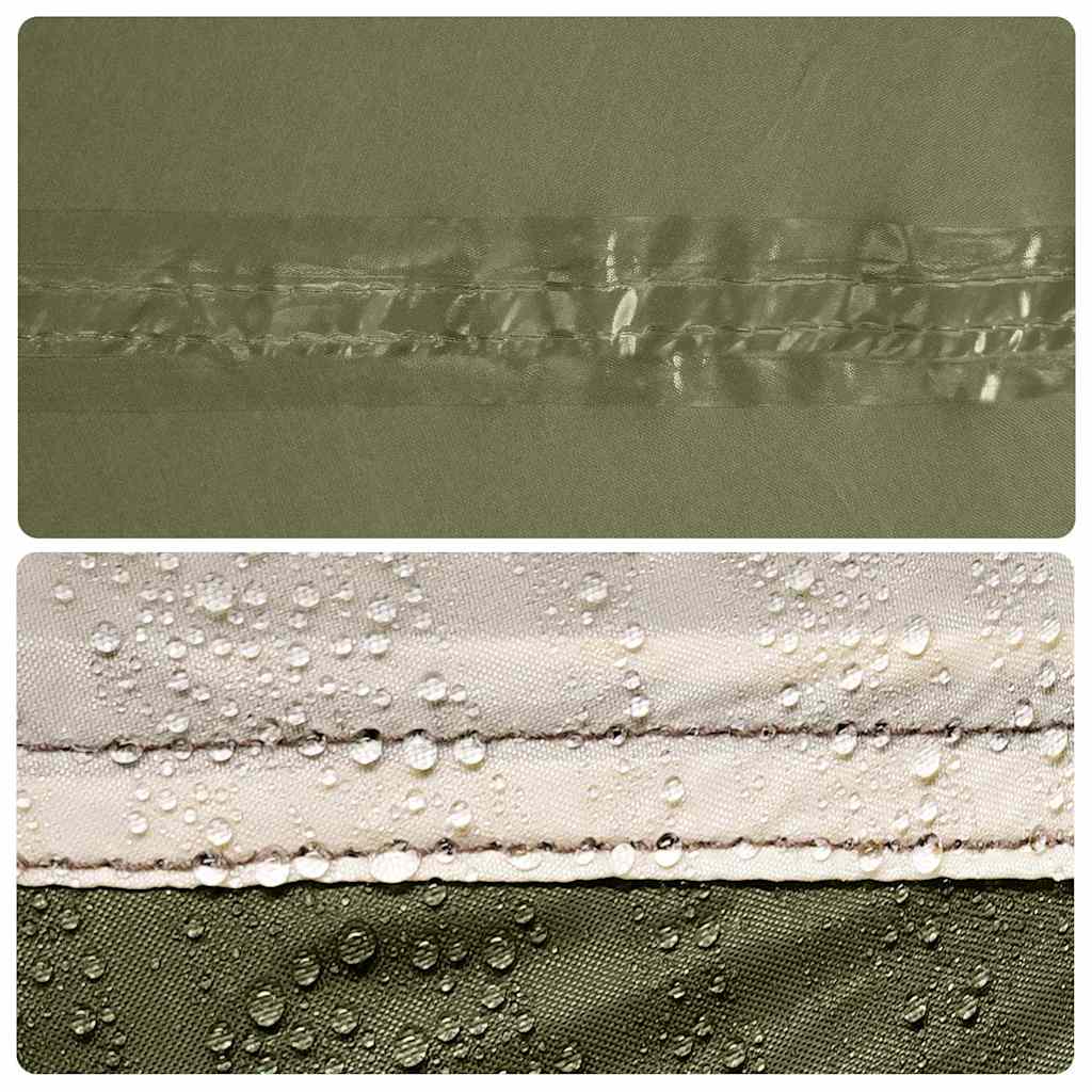 - Tartós taft anyag: Ez a ponyva taft szövetből készült PU bevonattal, így víz- és szélálló. Ezenkívül a ragasztott varratok hatékonyan megakadályozzák az esővíz beszivárgását, így a belső tér száraz és kényelmes marad.