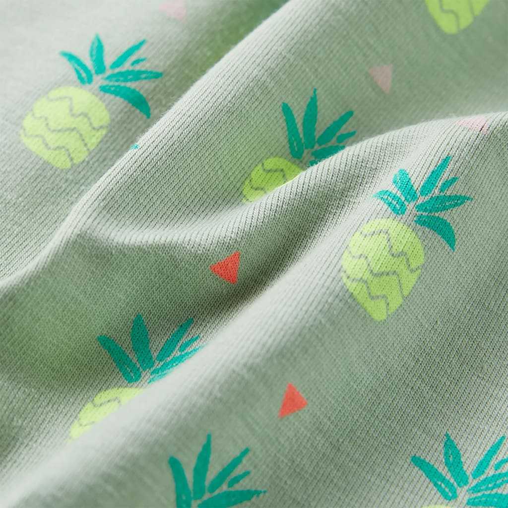 Ez a gyerekruha kerek nyakkivágással, teljes felületű nyomattal és húzózsinóros derékpánttal rendelkezik. Ez a gyerekruha a teljes felületén ananásznyomatos. A rövid gyerekruha puha anyagból készült, amely 92% pamutot és 8% elasztánt tartalmaz a kényelem és a légáteresztés érdekében.