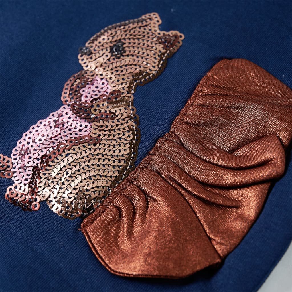 Ez a gyermek pulóver hosszú ujjú, kerek nyakú, bordás kötésű szegélyekkel rendelkezik a mandzsettáknál, a nyakkivágásnál és az alján. A gyerekfelső gyönyörű tengerészkék színű, 2 flitteres mókussal, ami extra vidámságot kölcsönöz.