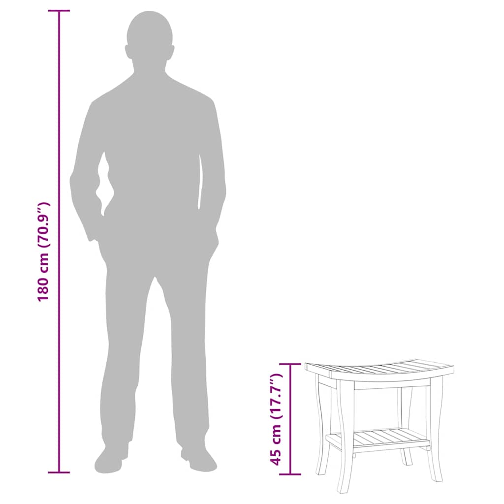- Tárolópolc: A A tíkfa kisasztal akár 10 kg-ot is elbír, ideális a fürdőkellékek, például törülközők, szappanok, samponok, testápolók, tusfürdők vagy illatos gyertyák tárolására. Mindezek a zuhanyzáshoz szükséges kellékek könnyen elérhetőek lesznek. Ülésre egyáltalán nem alkalmas.