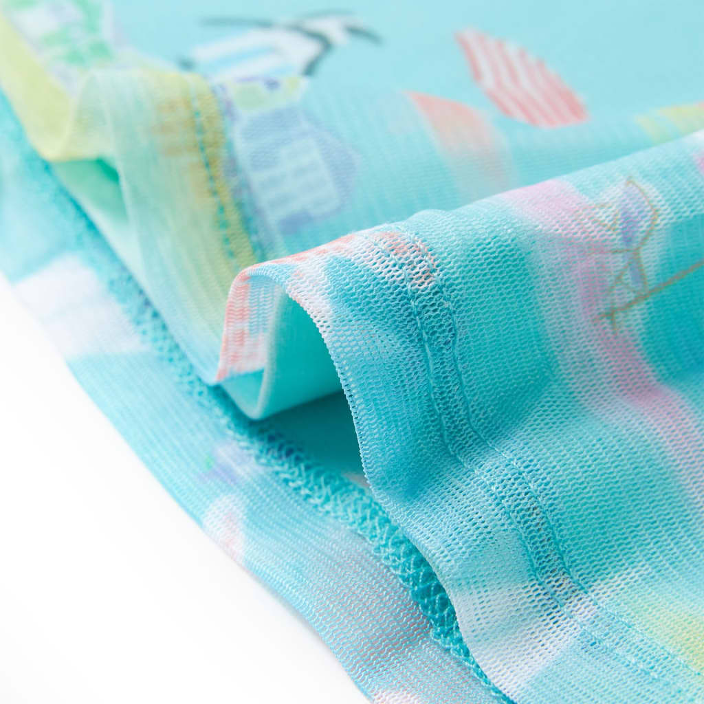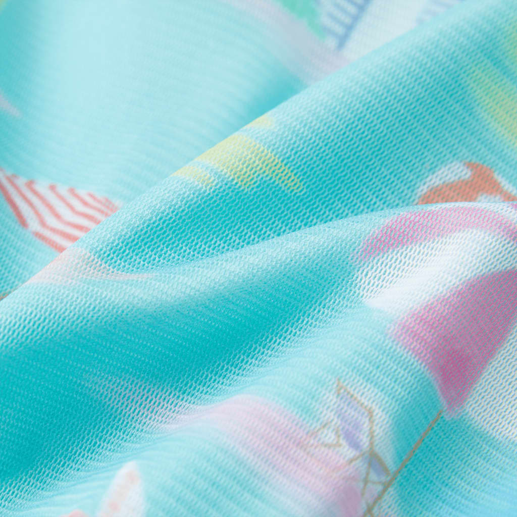 Ez a gyerekruha kerek nyakkivágással, vágott ujjakkal és elasztikus derékpánttal rendelkezik. Ez a gyerekruha hálós réteggel rendelkezik, amelynek teljes felületét tengerparti tájképek borítják. A rövid gyerekruha puha anyagból készült, amely poliésztert, pamutot és elasztánt tartalmaz a kényelem és a légáteresztés érdekében.