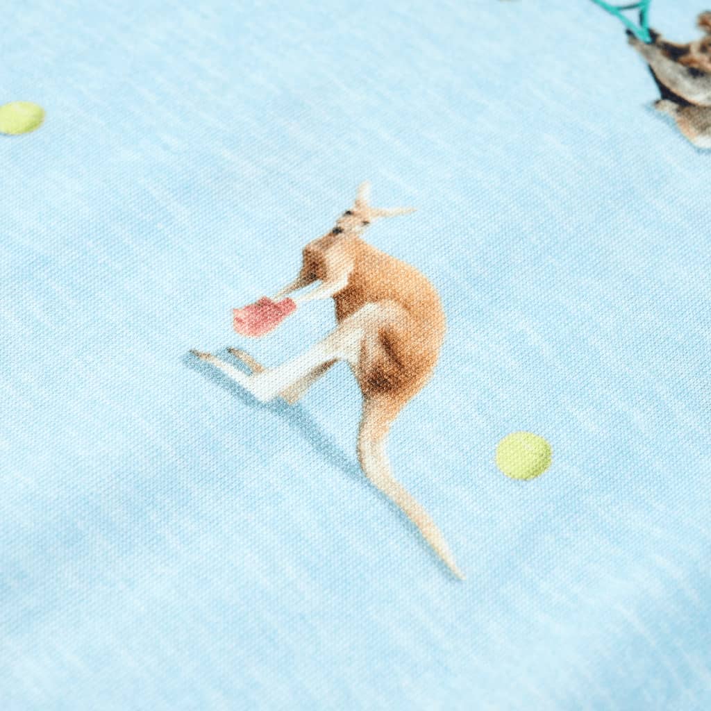 Ez a rövid ujjú gyerekpóló kerek nyakkivágású és egyenes szabású. Ez a póló különféle állatokat, teniszlabdákat és gördeszkákat tartalmaz. A rövid ujjú gyerekpóló 100% pamutból készült a puha és kényelmes tapintás érdekében.
