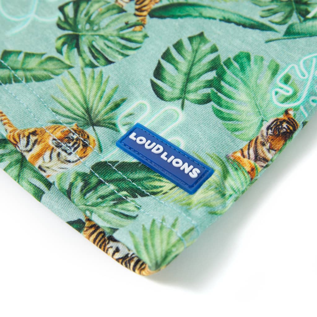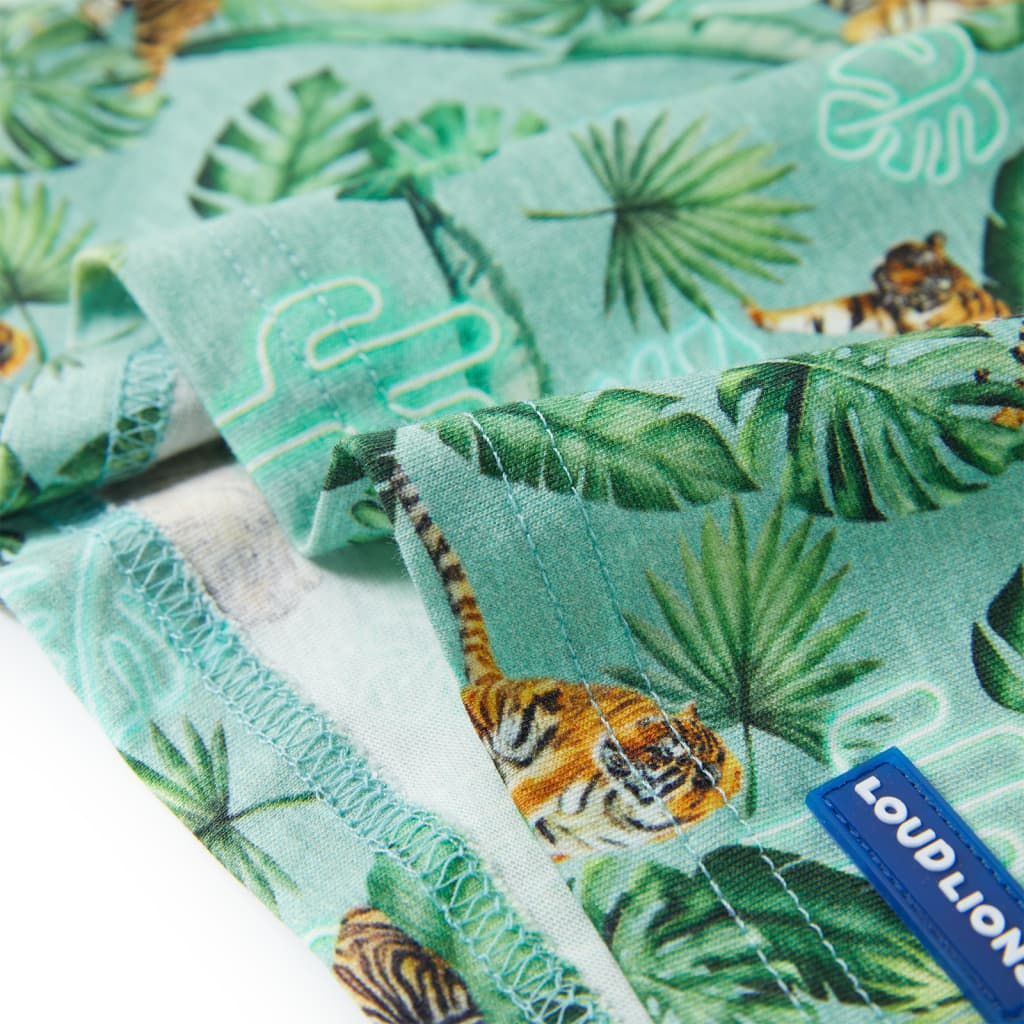 Ez a rövid ujjú gyerekpóló kerek nyakkivágású és egyenes szabású. Ez a póló tigrisekkel és növényekkel van nyomtatva. A rövid ujjú gyerekpóló 100% fésült pamutból készült, amely szilikon és enzimes mosással lett kezelve a puha és kényelmes érintés érdekében.